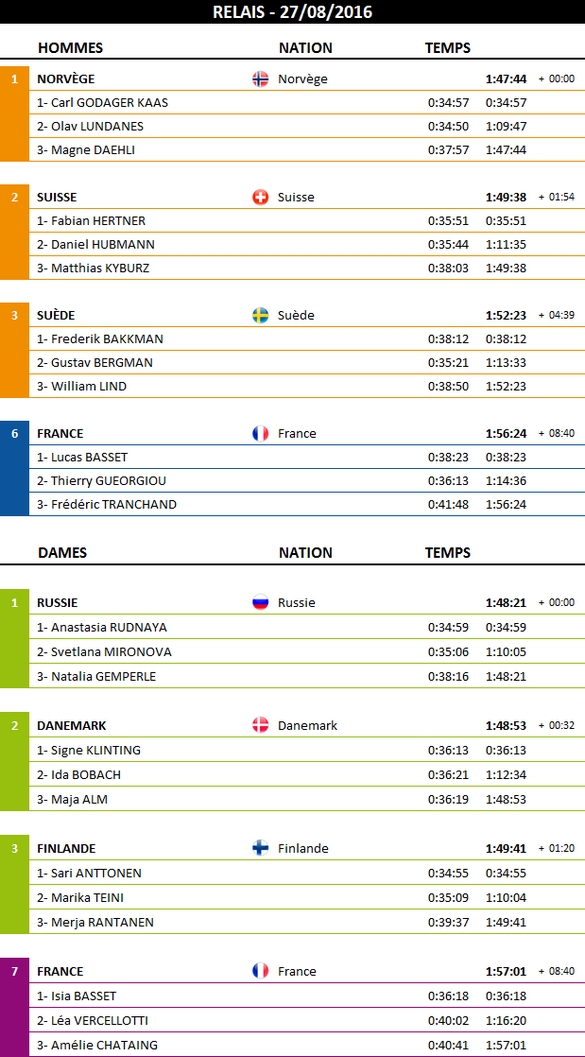 Hier, pour la dernière journée de compétition des championnats du monde 2016 en Suède, le relais hommes, avec Lucas Basset, Thierry Gueorgiou et Frédéric Tranchand, se classe 6e devant près de 8 000 spectateurs, et le relais dames, avec Isia Basset, Léa Vercellotti et Amélie Chataing, fini 7e. Les filles terminent avec le même retard que les hommes (+ 8:40).