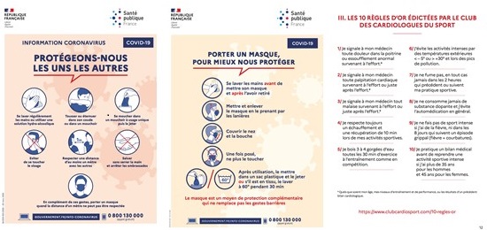 - le guide d'accompagnement de reprise des activités sportives. Les pages 7 et 8 concernant les recommandations sanitaires à la reprise sportive post confinement, pages 10 et 11 concernant les recommandations générales de reprise des activités sportives ainsi que les pages 31 et 32 sont à lire attentivement.