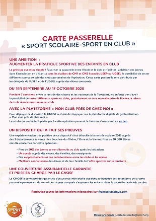 Dans la perspective de la reprise des activités pour les jeunes scolaires de vos clubs au moment de la rentrée de septembre 2020 le Comité National Olympique et Sportif Français a décidé en relation avec l’USEP et l’UGSEL de lancer une opération permettant la découverte du sport en clubs pour les élèves de CM1 et de CM2 au travers d’une opération intitulée « Carte passerelle Sport scolaire / Sport en club ». ...