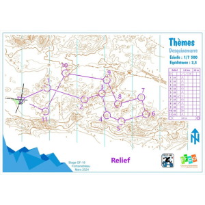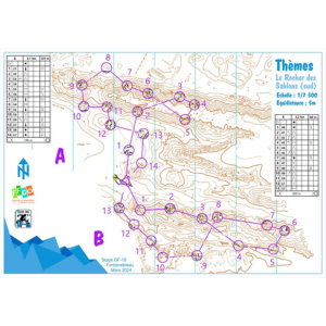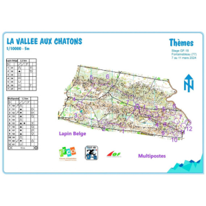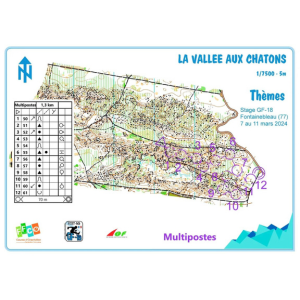 - Multipostes: 1,3km - 12P au 1/7500 : on continue sur le travail en approche de postes avec les mêmes objectifs que sur le microsprint de la veille, mais avec une échelle plus petite (1/7500). Circuit revenant au parking, plutôt en fin de séance, mais possible en milieu de séance avec récup pour revenir au départ.