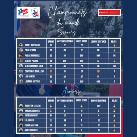 Les juniors tricolores ont particulièrement brillé grâce à Augustin Leclere, véritable révélation de ces Mondiaux. Il décroche trois titres mondiaux (sprint, mass start, relais) et une médaille d’argent en moyenne distance. Seule déception : la perte de son titre en longue distance après une erreur à la prise de carte (confusion entre carte élite et carte junior).